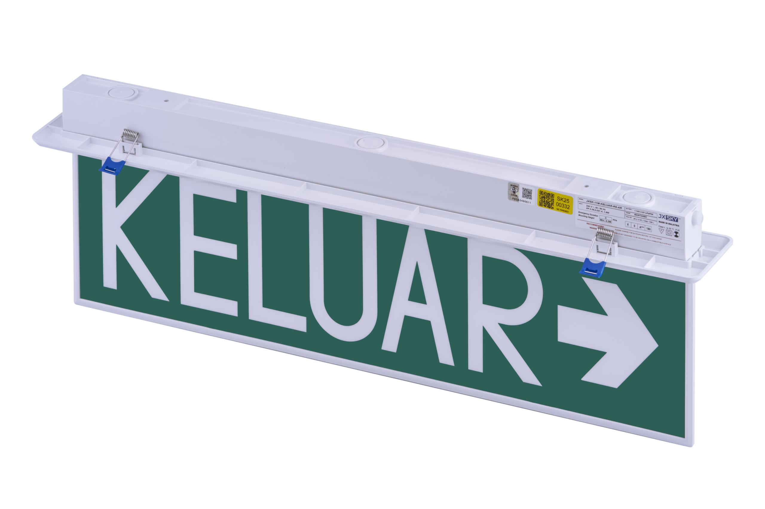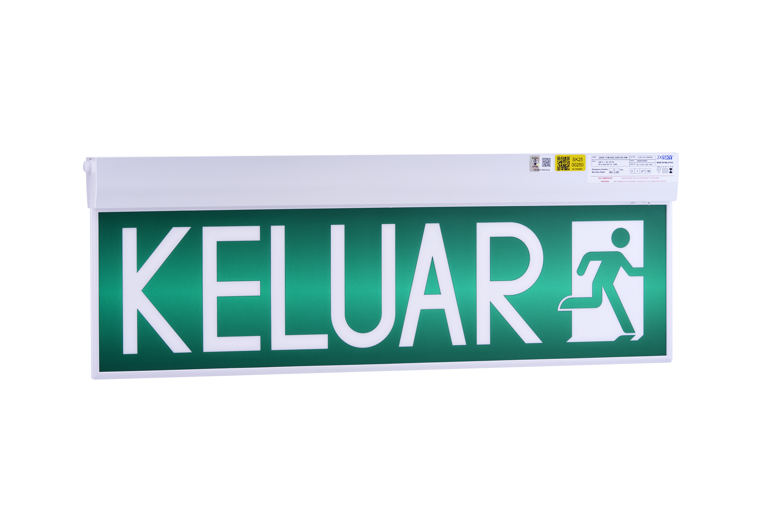 Stylish and efficient emergency exit sign featuring Samsung 3.0W LEDs for maintained mode operation. Provides consistent brightness, low power consumption, and supports up to 3 hours of emergency illumination. Designed for surface or recessed mounting, it includes a recessed frame for a refined appearance. Certified for safety, with a 1-year warranty.