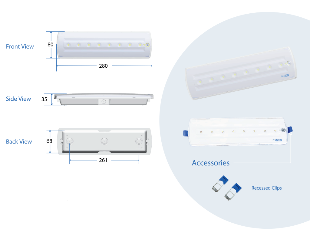 Versatile and sleek emergency lighting with Samsung 4.0W LEDs, offering up to 3 hours of illumination in non-maintained mode. Features low power consumption, durable lithium iron phosphate battery, and both surface and recessed mounting options. Certified for safety and quality, with an IP20/IP65 rating and a 1-year warranty.
